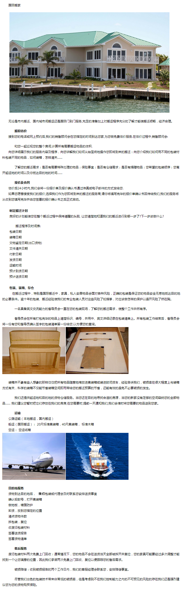 速洲搬家業務部是速洲物流設立的專業運營搬家公司|移民搬家|出國搬家|國際海運搬家的運輸部門。主要提供國際移民搬家,國際海運搬家服務。是專門為需要從當前地區搬家到其他城市的客戶提供的專業國際搬家運輸服務。速洲物流國際搬家運輸部,擁有豐富的搬家運輸經驗,擁有經驗豐富的專業移民搬家操作員工。我們竭誠為您提供搬家物品整理、上門估價、專業拆裝家具及生活電器等物品、專業紙箱木箱包裝、泡沫塑料打包、搬運、裝卸、運輸、搬家物品臨時存儲存放等壹站式(門對門)搬家運輸服務。我們本著“真心、熱心、細心”的服務宗旨,“安全運輸、及時送達、高效運轉、感動服務”的服務理念,依托公司自身優勢物流運輸網絡,為廣大客戶提供最具競爭力的出國搬家到國外各地的優質服務,“隨時、隨地、隨您”是我們對每壹位客戶的承諾 速洲搬家運輸部,致力於為客戶提供優勢的國際搬家運輸資源,致力於為客戶提供優質的國際搬家運輸服務。